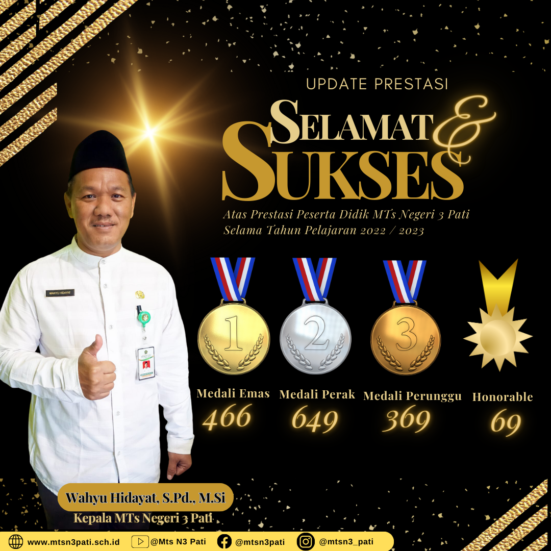 MTs Negeri 3 Pati merayakan momen kebanggaan yang luar biasa atas rangkaian prestasi gemilang yang telah dicapai selama tahun pelajaran 2022-2023. Para peserta didik kami telah menorehkan catatan memukau dengan meraih medali emas, perak, perunggu, dan penghargaan honorable dalam berbagai kompetisi dan kegiatan di tingkat regional, nasional, dan internasional.