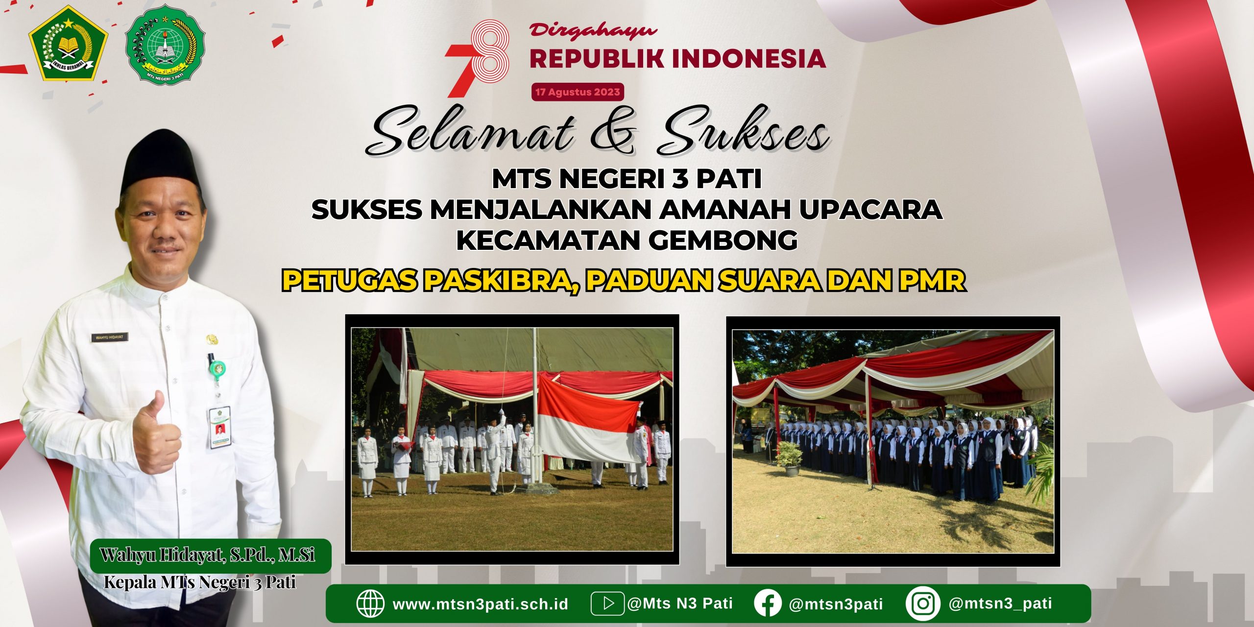 Kepala MTs Negeri 3 Pati, Bapak Wahyu Hidayat, S.Pd., M.Si., merasa bangga dengan prestasi yang diraih oleh para peserta diidknya. “Prestasi ini adalah hasil dari kerja keras dan persiapan yang matang dari semua pihak yang terlibat. Kami berharap bahwa semangat kemerdekaan dan nilai-nilai kepahlawanan yang ditunjukkan dalam upacara ini dapat menginspirasi generasi muda untuk terus mencintai dan berjuang untuk negara,” ujarnya dengan penuh semangat.